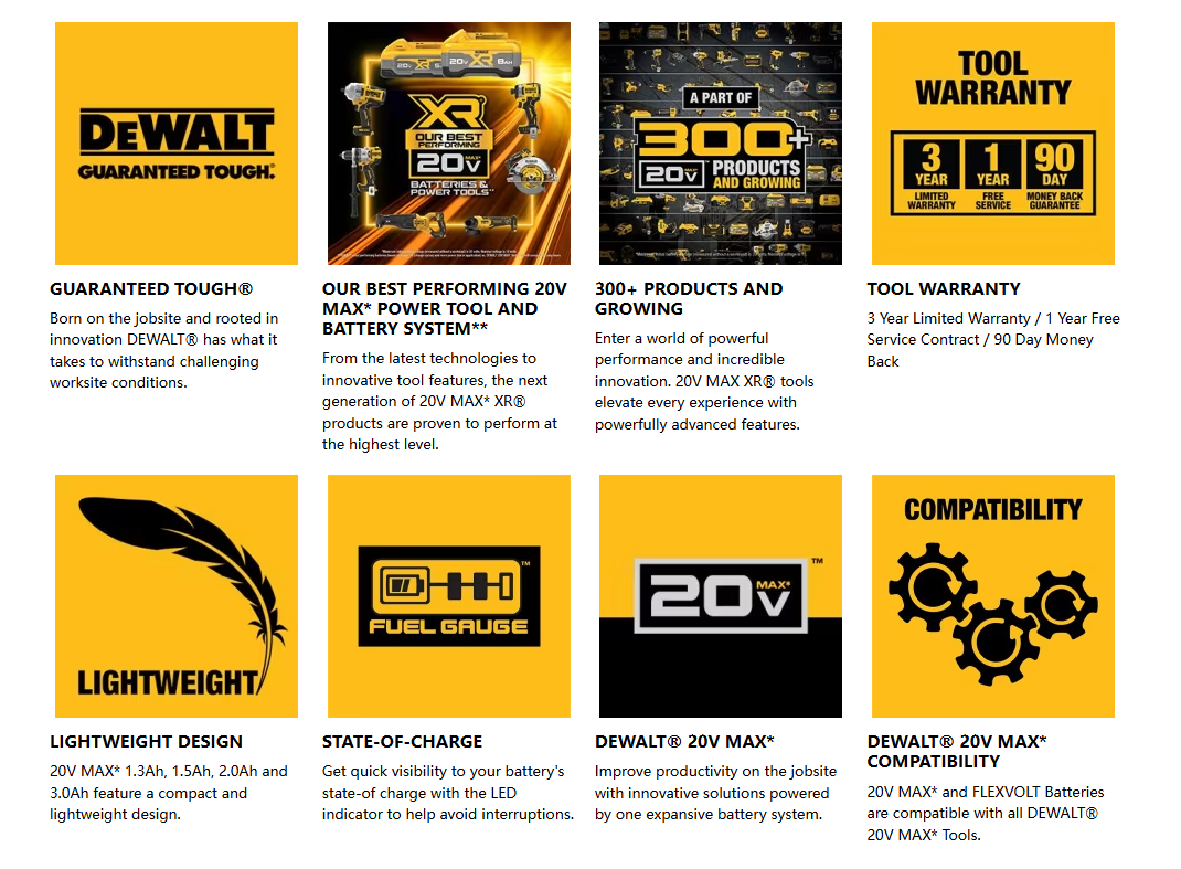 Incluye protección contra sobrecarga electrónica y múltiples funciones de seguridad al cargar baterías. Puede usarse en obras, estilo de vida, camping o emergencias, sin gas, sin emisiones ni ruido de motor, y en prácticamente cualquier lugar seco. Compatible también con paquetes de baterías DEWALT FLEXVOLT.