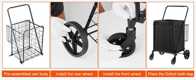 El carrito de compras utilitario está equipado con con dos ruedas traseras de PP, lo que garantiza un rodado suave incluso cuando está completamente cargado. Además, dos ruedas giratorias de 360 grados en la parte delantera permiten cambios de dirección sin esfuerzo en aceras con baches o en pasillos comerciales.