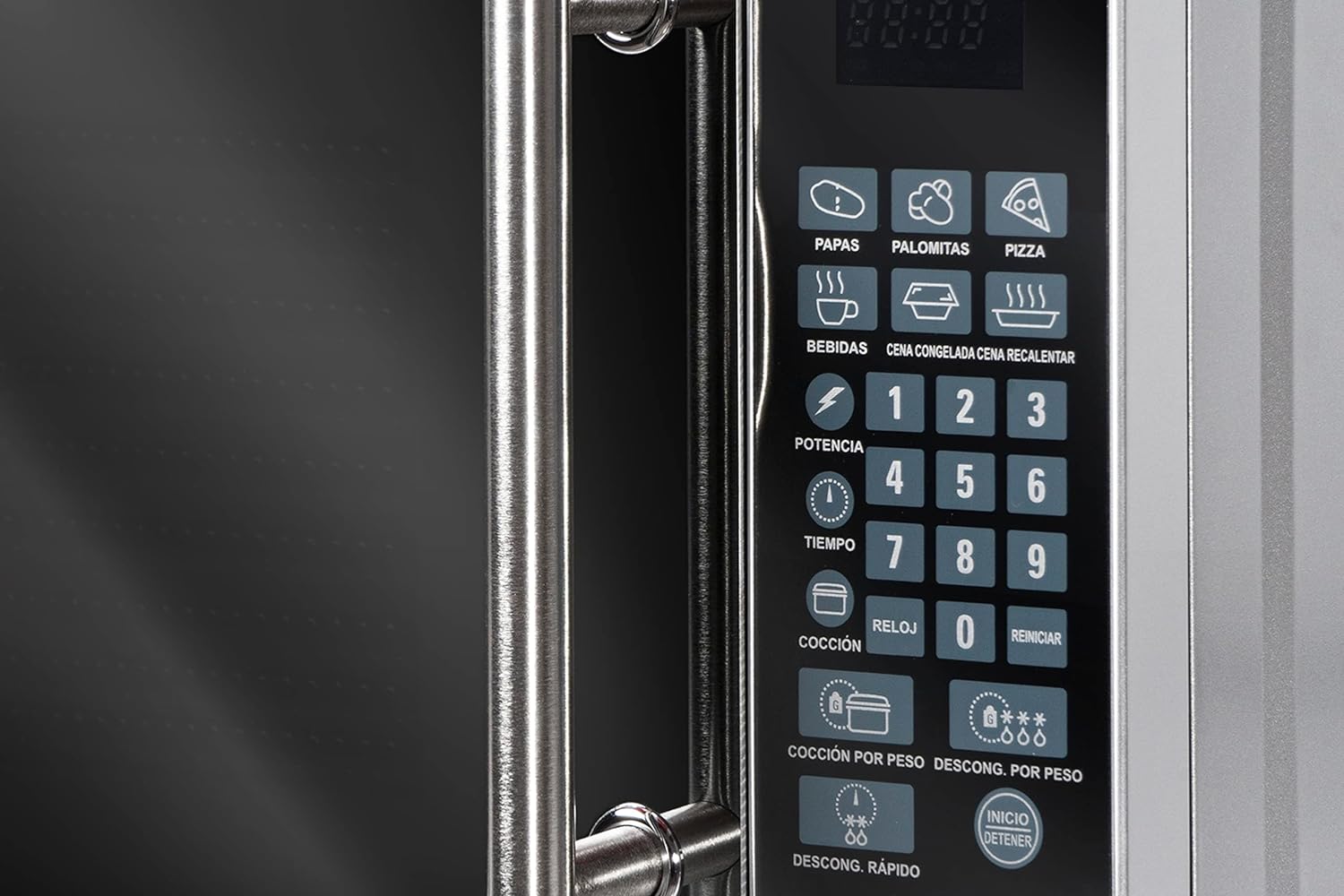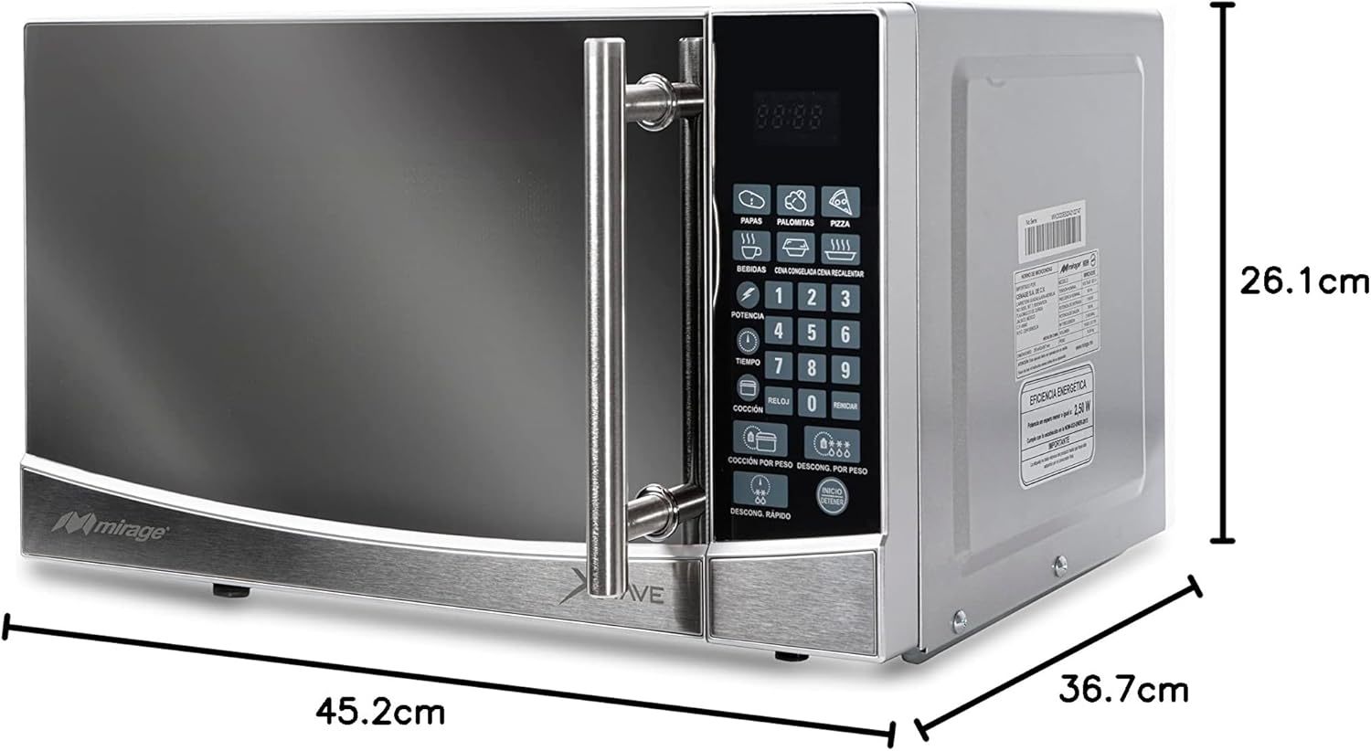 VOLTAJE DE ALIMENTACIÓN 120 V~ POTENCIA DE SALIDA 700w CAPACIDAD 0.7 Pies³ TIPO DE CONTROL Membrana Táctil TIPO DE LUZ INTERIOR LED TIPO DE LUZ INTERIOR LED ACABADO Espejo COLOR Plata TIPO DE LUZ INTERIOR LED DIMENSIONES SIN EMPAQUE (WxHxD)(mm) 452x261x367 DIMENSIONES CON EMPAQUE (WxHxD)(mm) 496x292x380 PESO NETO (Kg) 10.5