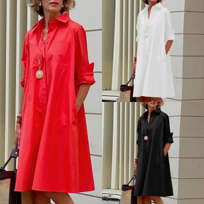Con un elegante cuello clásico tipo "turn-down" y mangas largas, el diseño de este vestido resalta la simplicidad sin perder el toque refinado. Además, los bolsillos funcionales no solo agregan estilo, sino que también aportan practicidad a tu atuendo diario.