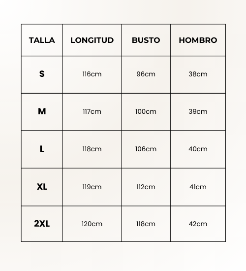 Encuentra tu talla ideal en nuestra tabla de medidas y descubre el ajuste perfecto. Diseñamos este vestido para adaptarse a todos los tipos de cuerpo, brindándote una prenda que te envuelve con estilo y comodidad.