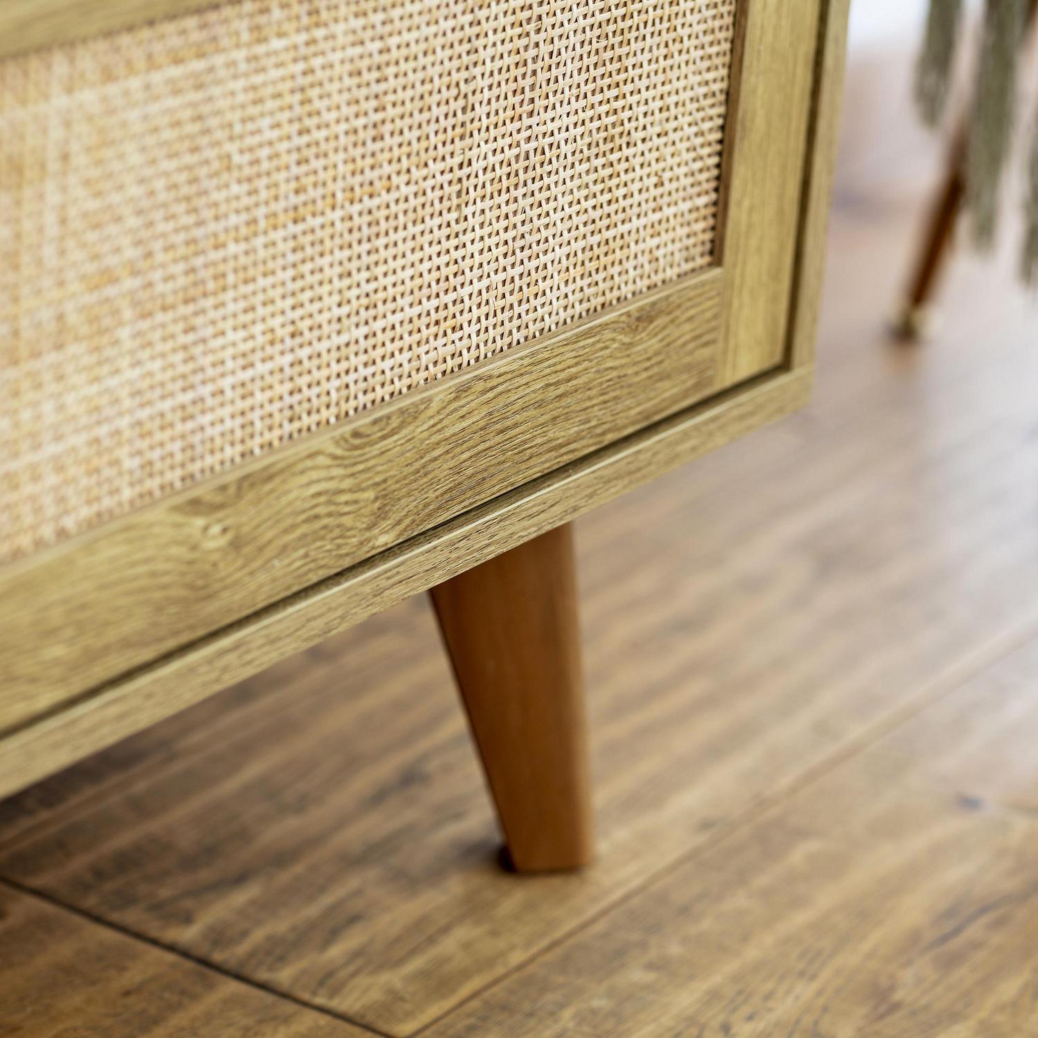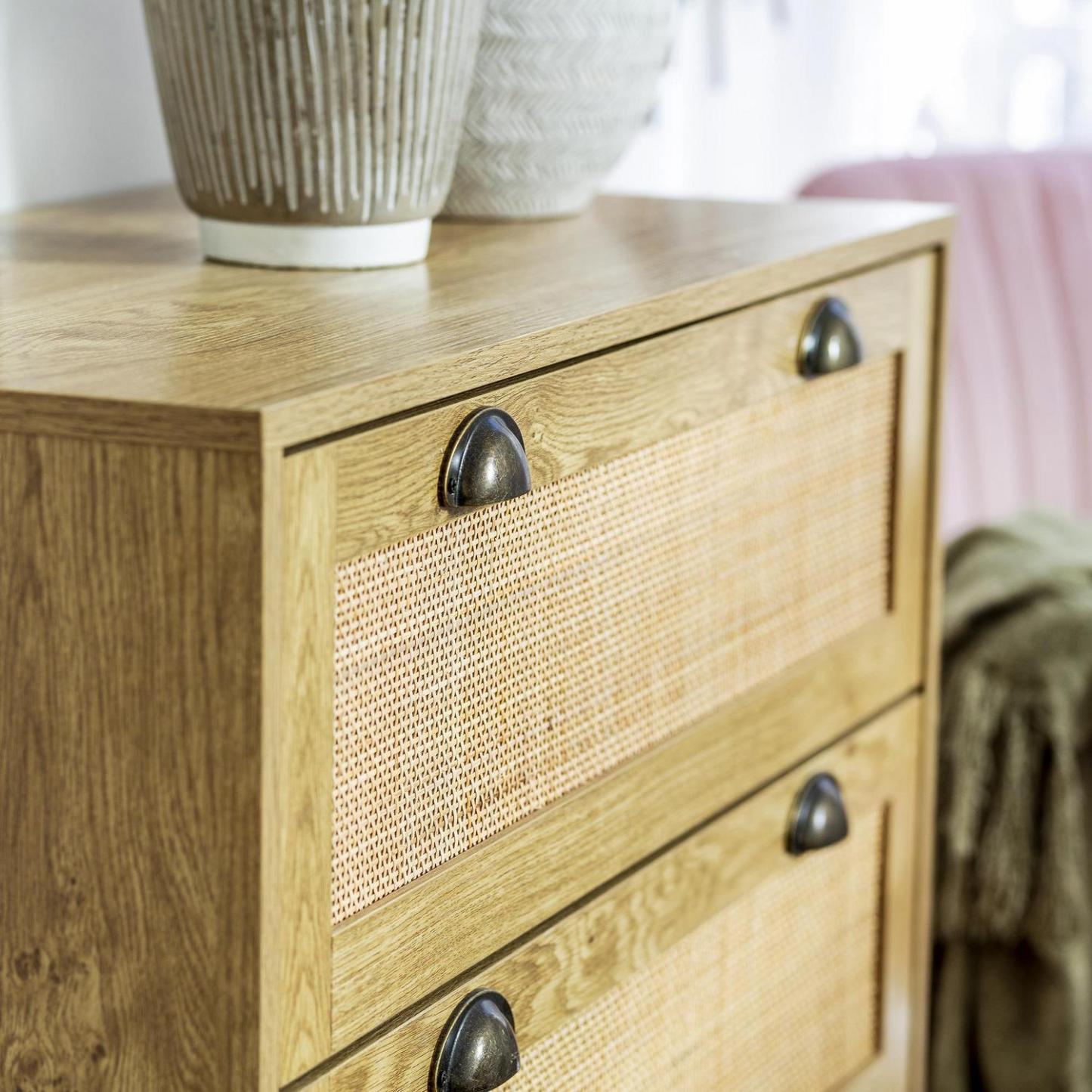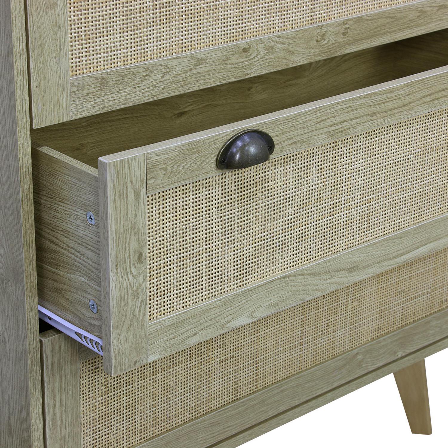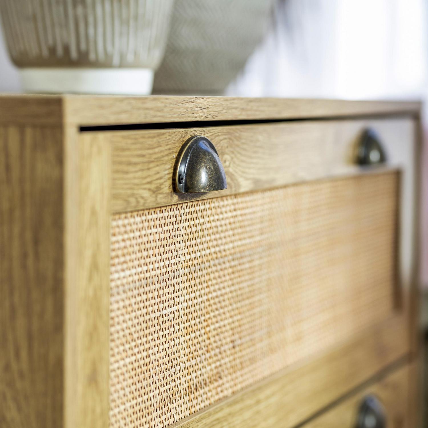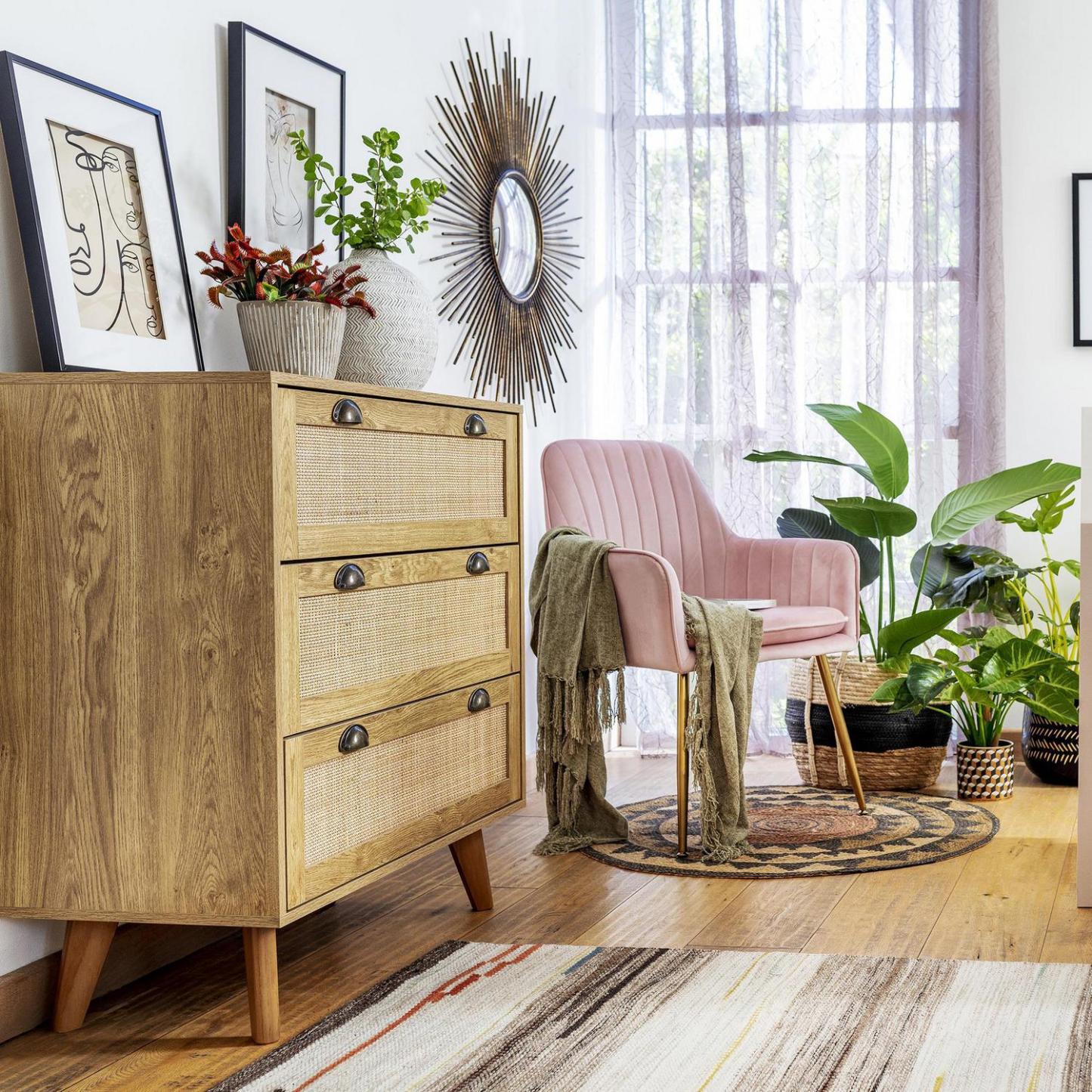 Dale un toque boho chic a tu hogar con nuestra cómoda de ratán. Su diseño elegante y natural, con tres cajones espaciosos, te ofrece amplio espacio para guardar tus cosas. Fabricada en madera con un acabado texturizado café, esta cómoda de 80 cm de ancho, 90 cm de alto y 40 cm de profundidad, se adapta a cualquier ambiente, creando un espacio acogedor y sofisticado. ¡No esperes más para darle a tu dormitorio o living room el estilo que siempre soñaste!